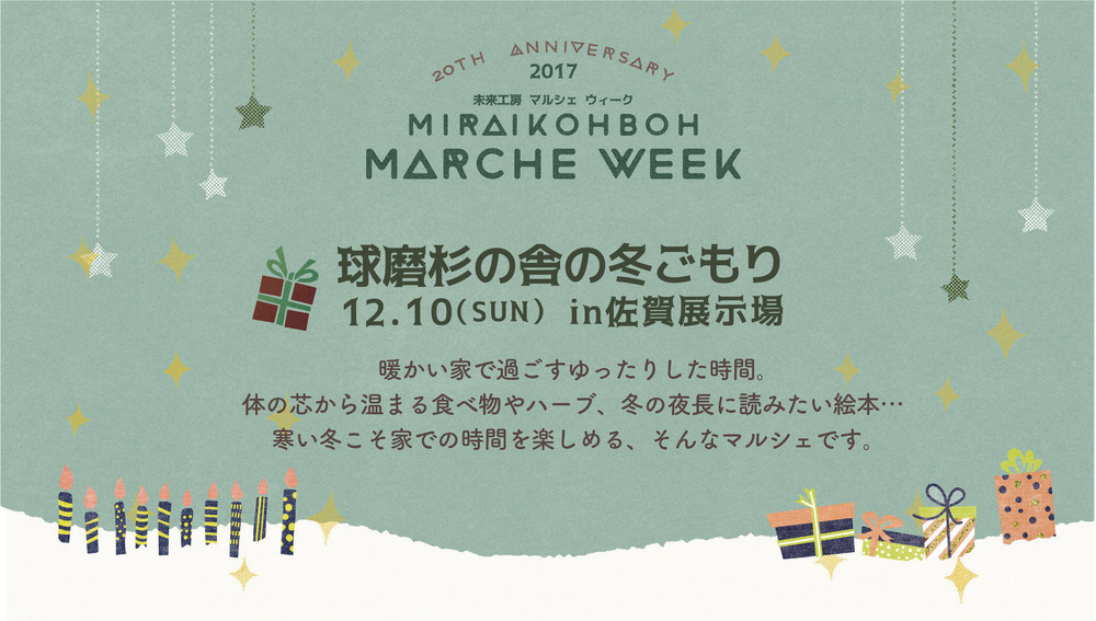 【豊かな暮らしの場をつくる工務店として思うこと】「日々を暮らす」ことが、単なる「住む」とか「居る」でなく、「生きる」とも言えるほどの豊かな時間になる、自分たちの手でそうすることができる、ということ。このマルシェをきっかけに、日常を豊かにする「本物」との新たな出会いが訪れますように!【未来工房マルシェウィーク・球磨杉の舎の冬ごもり】 日 時:12月10日(日)10:00〜15:00 場 所:未来工房佐賀展示場 〒840-0804 佐賀市神野東4-4-26●出店されるお店は以下の通りです。・ SASABAGeL (うきは市) ベーグル・KILOATBOA(みやま市) バッグや財布などの革製品・旅するクーネル (三瀬村) スパイス、素材にこだわったカレー・coricco kitchen&market(太宰府市) オリーブオイル・KITORI(鳥栖市) 国産・化学調味料無添加の唐揚げ・ケンジーズドーナツ(福岡市) 卵、乳製品、植物性食品不使用の焼きドーナツ・アロマとハーブの教室 “Hand made MaMa”(佐賀市) オリジナルハーブミックス・Olivier Rain(八女市) 添加物を使わず地産地消にこだわったパン・心も体も素直になれるご飯やさん 野歩ほん(筑後市) 地元野菜をたっぷり使ったお弁当・maristarcafe(唐津市) 農薬不使用の野菜と果物のホットスムージーなど・Cafeみちくさ(佐賀市) 一杯だてのコーヒー・ナヤンコ書店(大野城市) レトロ雑貨・子どもの本屋ピピン (佐賀市) 絵本の販売、絵本の読み聞かせ(随時)・フラワー花友(佐賀市) グリーンや雑貨 スワッグのワークショップを開催(随時)・長岡順やさい(基山町) 農薬を使用せず栽培した野菜・ちいさなうつわや陶兎屋(筑後市) 器・雑貨・小城鍋島家Ten(小城市) あったかいおでん・じぶんでつくる専門店 いわいのわ (佐賀市) 木工雑貨・焼き菓子展示場内に休憩コーナーもあります。ゆっくりお過ごしください。●雨天決行・参加自由●駅近隣の駐車場をご利用ください。