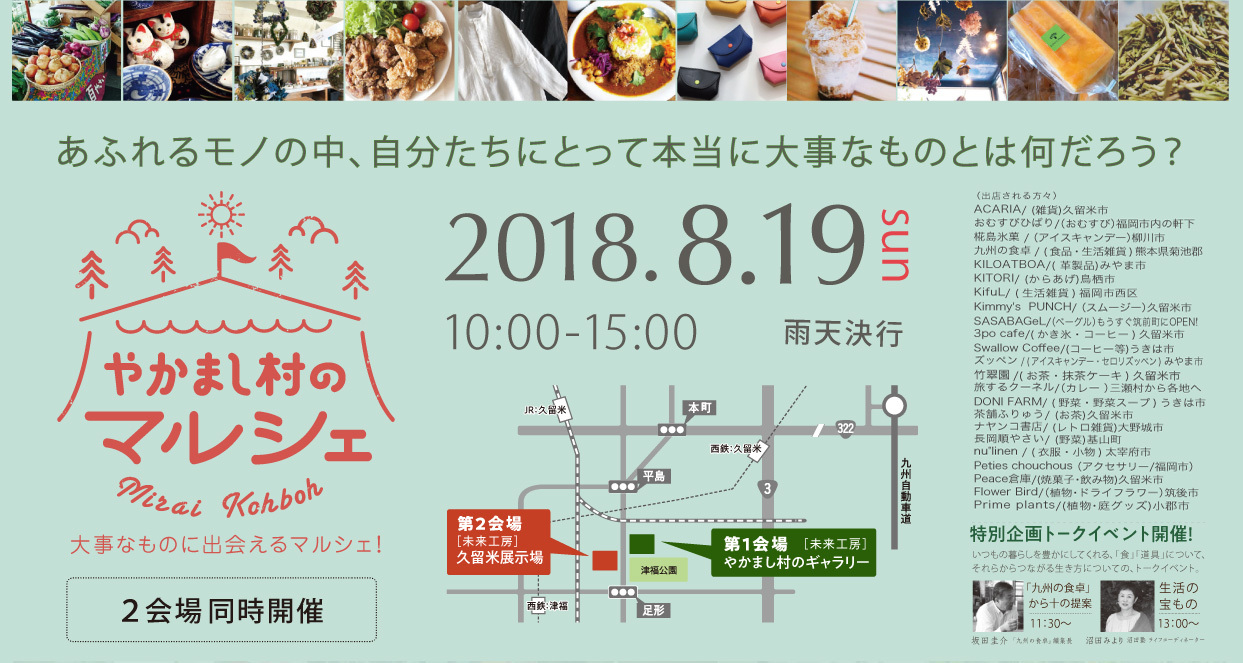 あふれるモノの中、自分たちにとって本当に大事なものとはなんだろう?それを考えるきっかけとなるマルシェ。ここで選んだ「モノ」や知った「コト」で、いつもの暮らしが豊かになる。そんな「選ぶ」「知る」を散りばめて、使う(食べる)人の心も体も豊かにすることができる「本物」を集めたマルシェです。今回は、「未来工房久留米展示場」「やかまし村のギャラリー」の二会場同時開催!●時 間:10:00-15:00●第一会場(やかまし村のギャラリー)・nu゜linen/衣服・小物・KifuL/生活雑貨・九州の食卓/食品・生活雑貨・3po cafe/かき氷・コーヒー・DONI FARM/野菜・野菜スープ・ごはんの種をまく日々/ぜんざい●第二会場(未来工房久留米展示場)・ナヤンコ書店/レトロ雑貨・ACARIA/雑貨・Prime plants/植物・庭グッズ・長岡順やさい/野菜・KITORI/からあげ・旅するクーネル/カレー・Peace倉庫/焼菓子・飲み物・KILOATBOA/革製品・Flower Bird/植物・ドライフラワー・Peties chouchous/アクセサリー・ズッペン/アイスキャンデー・セロリズッペン・おむすびひばり/おむすび・Swallow Coffee/コーヒー等・SASABAGeL/ベーグル・茶舗ふりゅう/お茶・椛島氷菓/アイスキャンデー・Kimmys PUNCH/スムージー