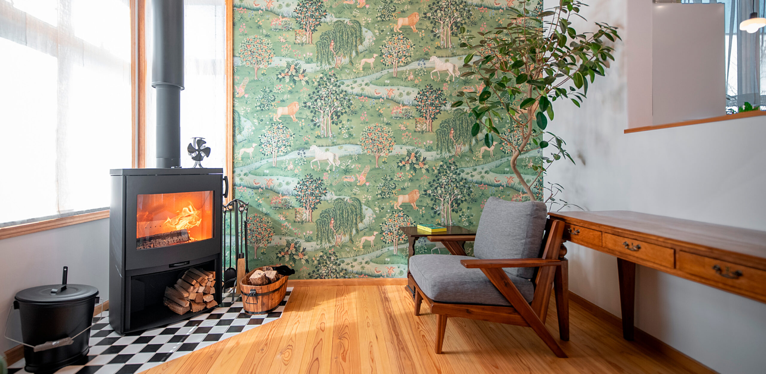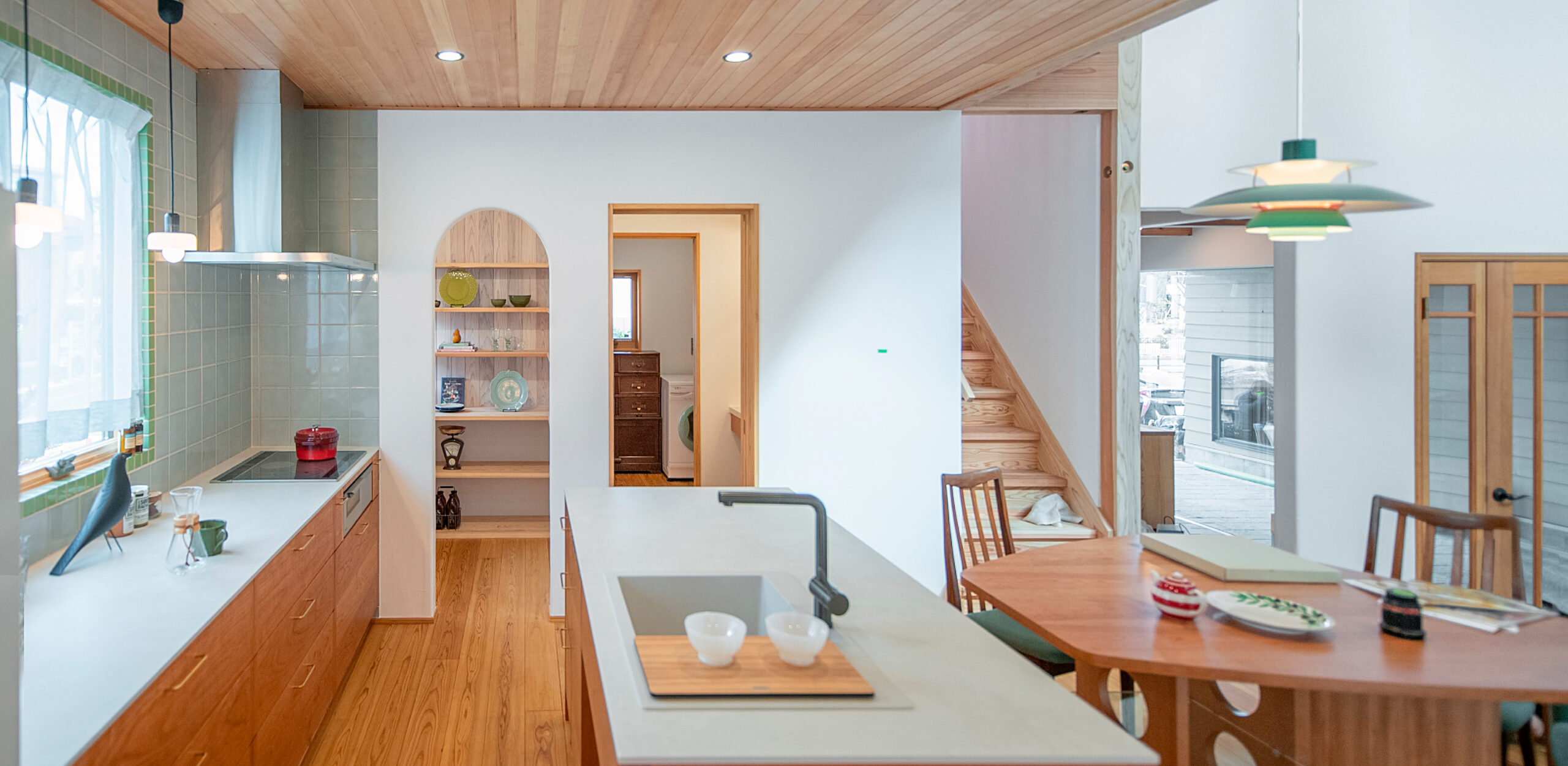 輸入クロス、輸入サッシ、造作キッチン、タイルなど、未来工房らしいインテリアや、もちろん薪ストーブも。