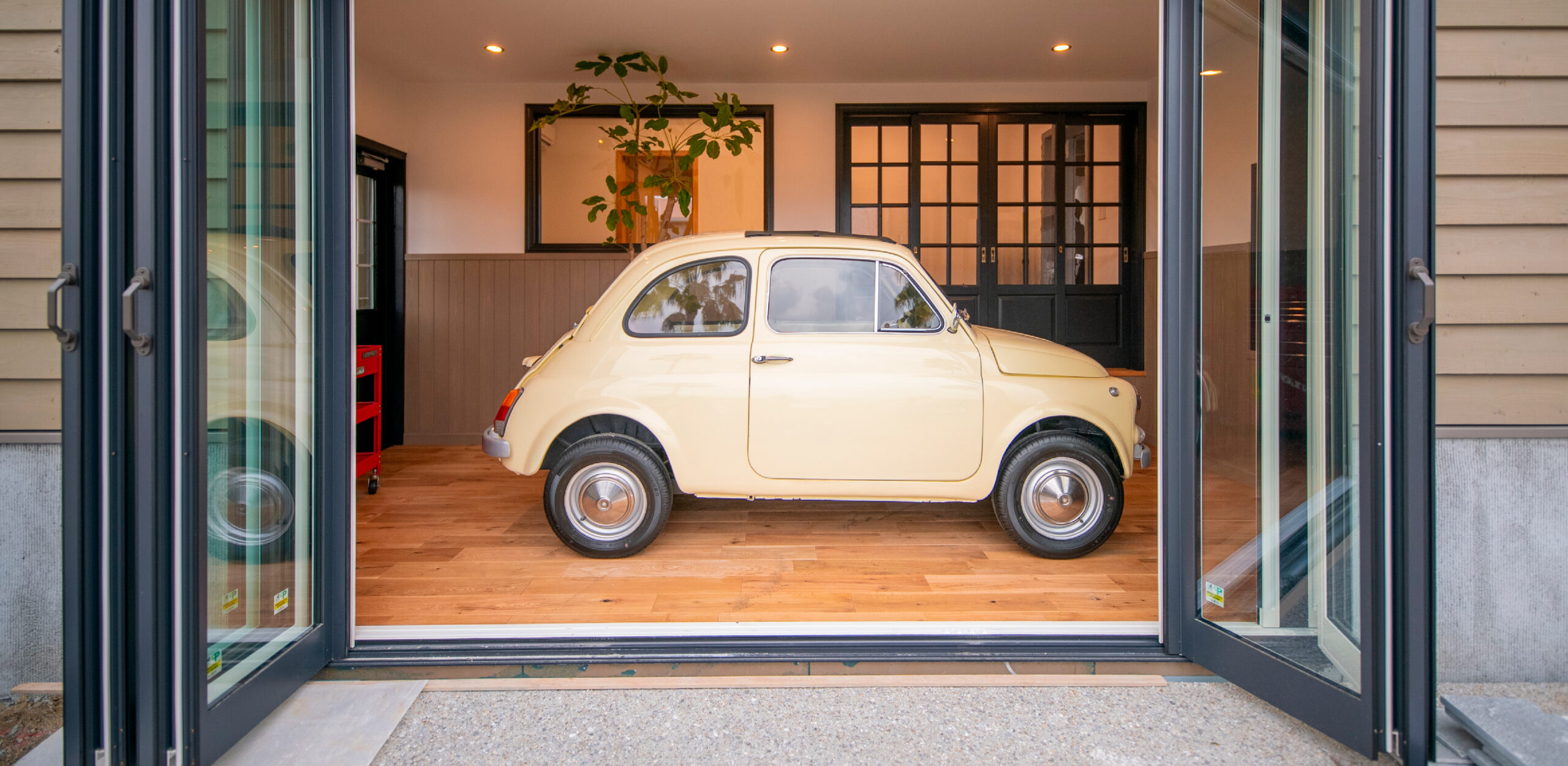 リビングとインナーガレージを隔てるのは大きなガラス。絵を飾るように、ガラス越しの愛車や釣り道具がリビングのインテリアに。