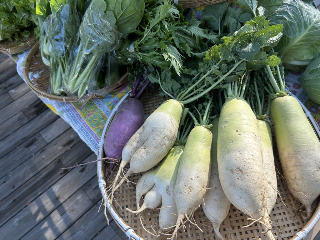 小松菜は生で食べても甘みがあってサラダにもおすすめ、大根も寒くなるにつれて甘くなり、サイズも大きくなるそうです。