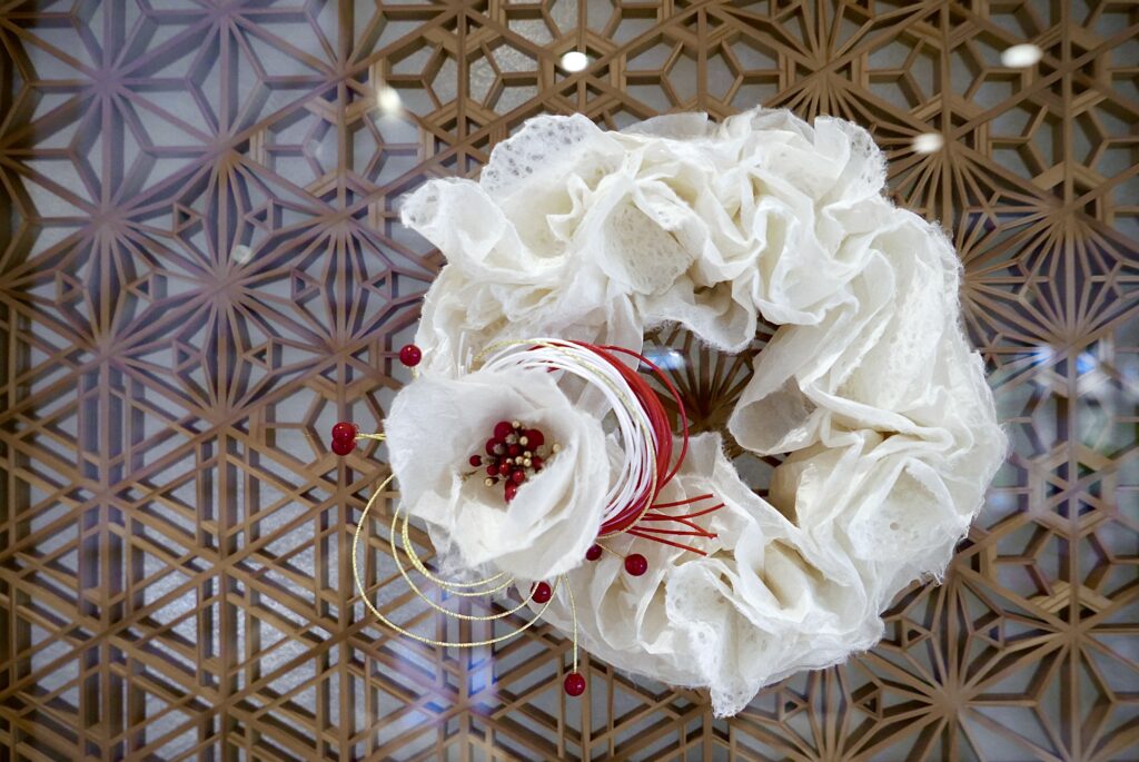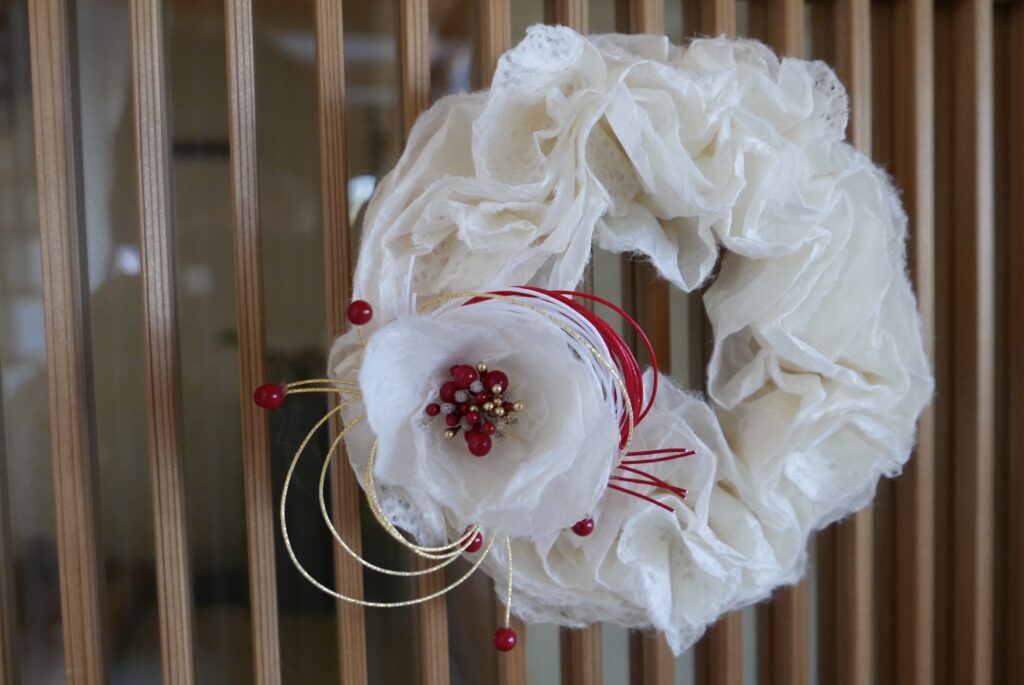 新年を迎える特別な手すき和紙リースを一緒に作りませんか?柔らかな和紙と、赤と金の水引きをあしらった、華やかで優しいリースを作ります。