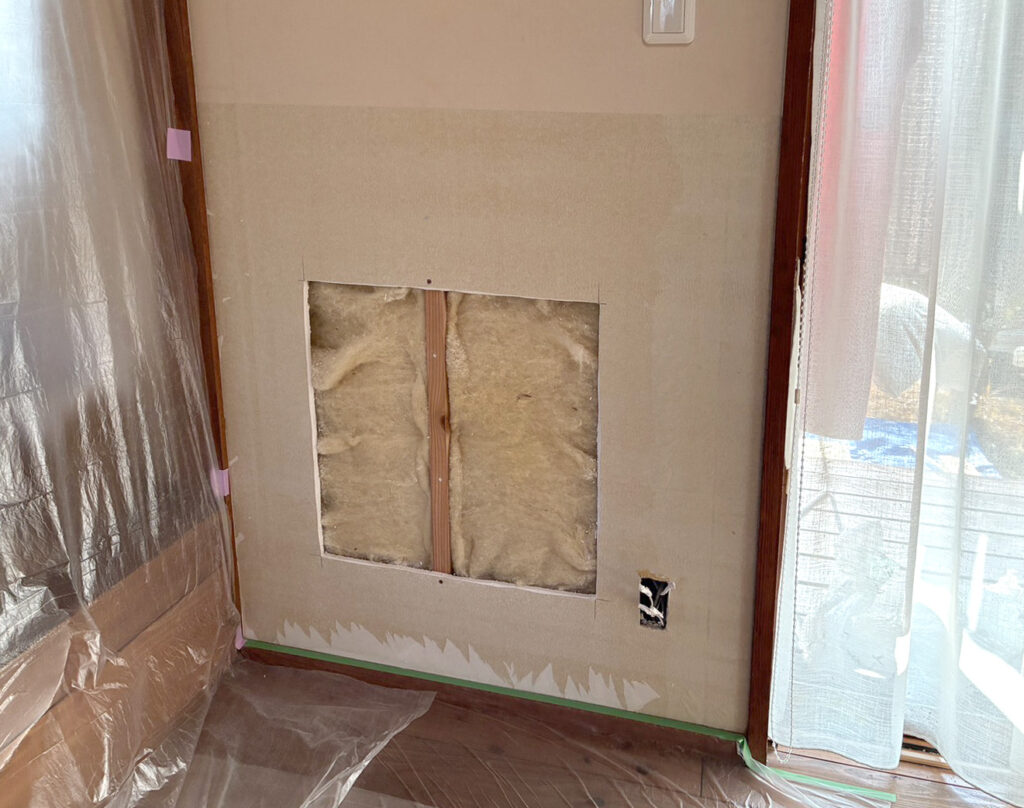 凹んだ部分のボードをカット。羊毛断熱材はダレることなくきれいなままですね!