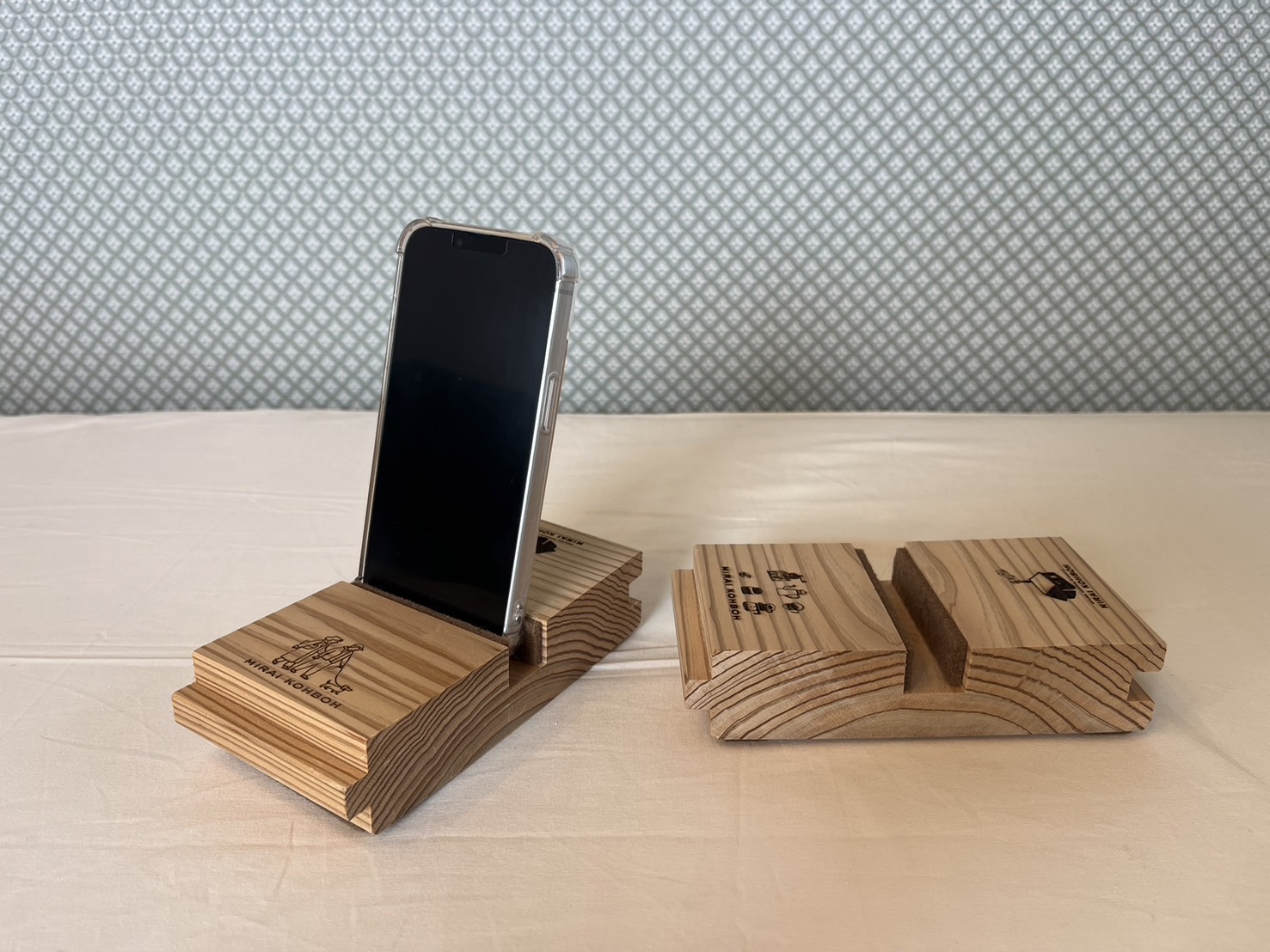 このスマホスタンドは、実際の家づくりで使用している厚さ35mmの床材(杉)を使っています。