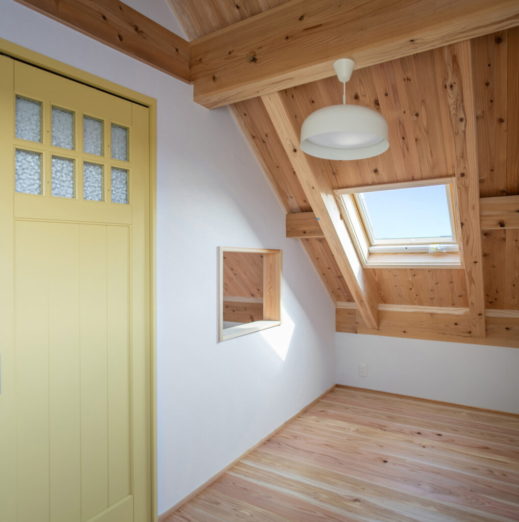 ・天窓のある、屋根裏部屋のような子ども部屋。小さな扉の先には秘密基地も。