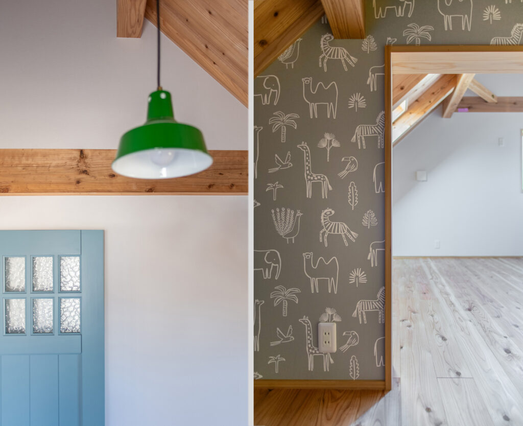 ・やわらかい色合いに動物や植物が描かれた紙クロス、パントリーの入り口に塗り壁のR仕上げと、