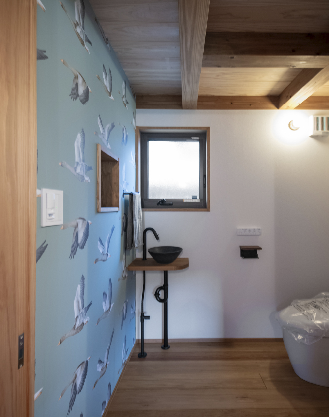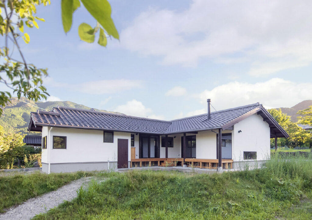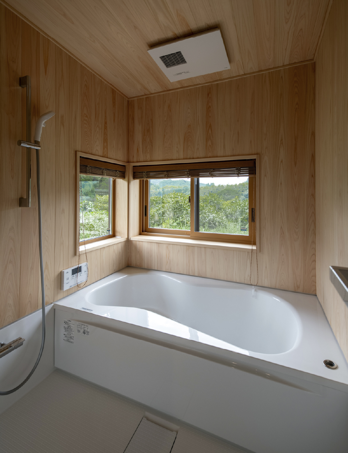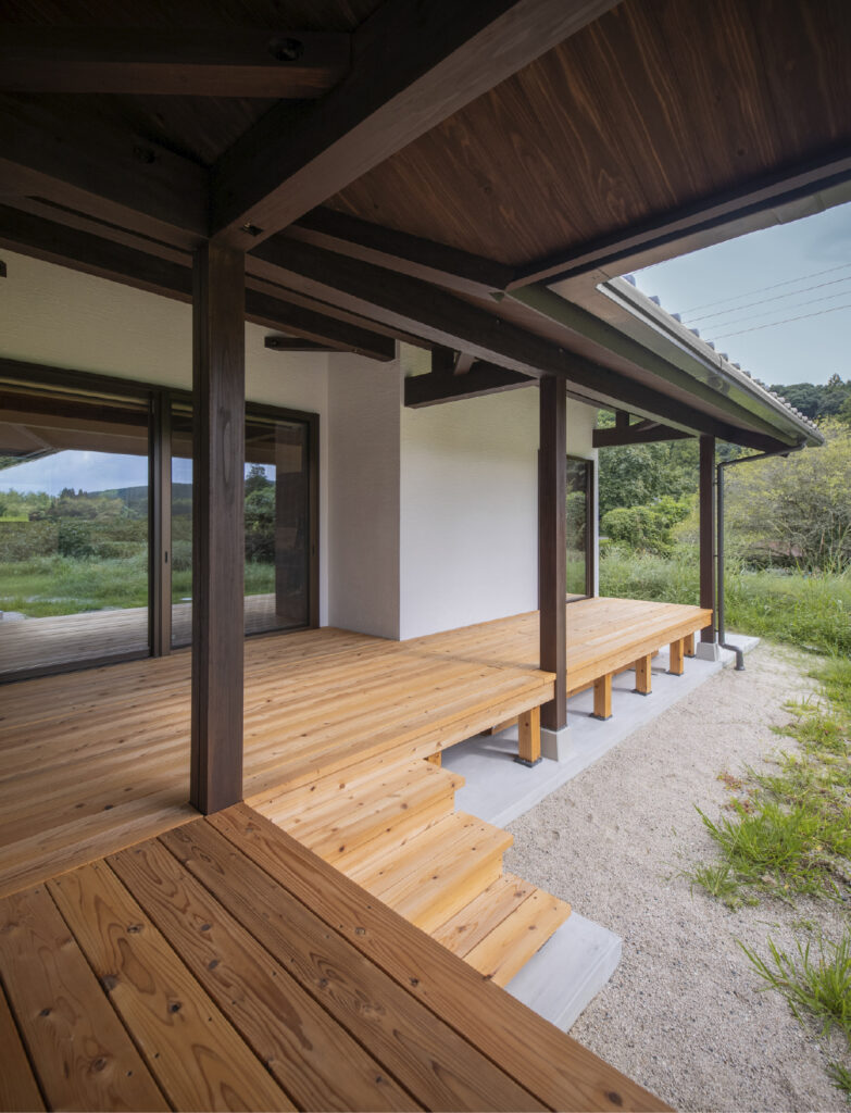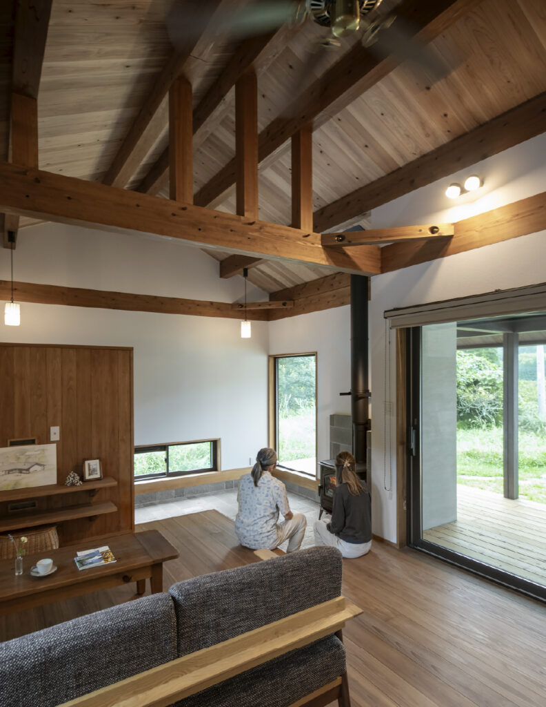 完成したYさん邸は、西側の景色を楽しめるL字型の間取りが特徴です。道路や隣地からの視線に配慮しながら、自然とのつながりを感じられるよう、大きな開口部とウッドデッキを設けました。ご夫妻の希望だった薪ストーブや眺めのよいお風呂、それぞれの寝室も実現。玄関からデッキへと続く広い土間には薪ストーブを設置し、腰掛けて炎を楽しめるくつろぎの空間になっています。段差のない床や、将来スロープを設けられる玄関など、バリアフリーにも配慮。個室を設けつつも、ドアを最小限にすることで、お互いの気配を感じられる住まいとしました。