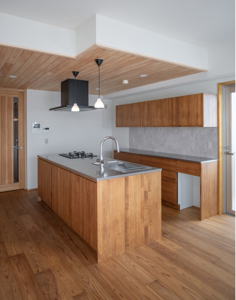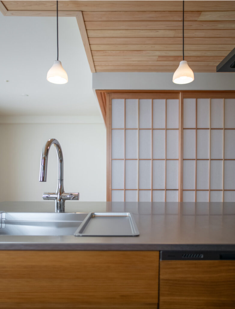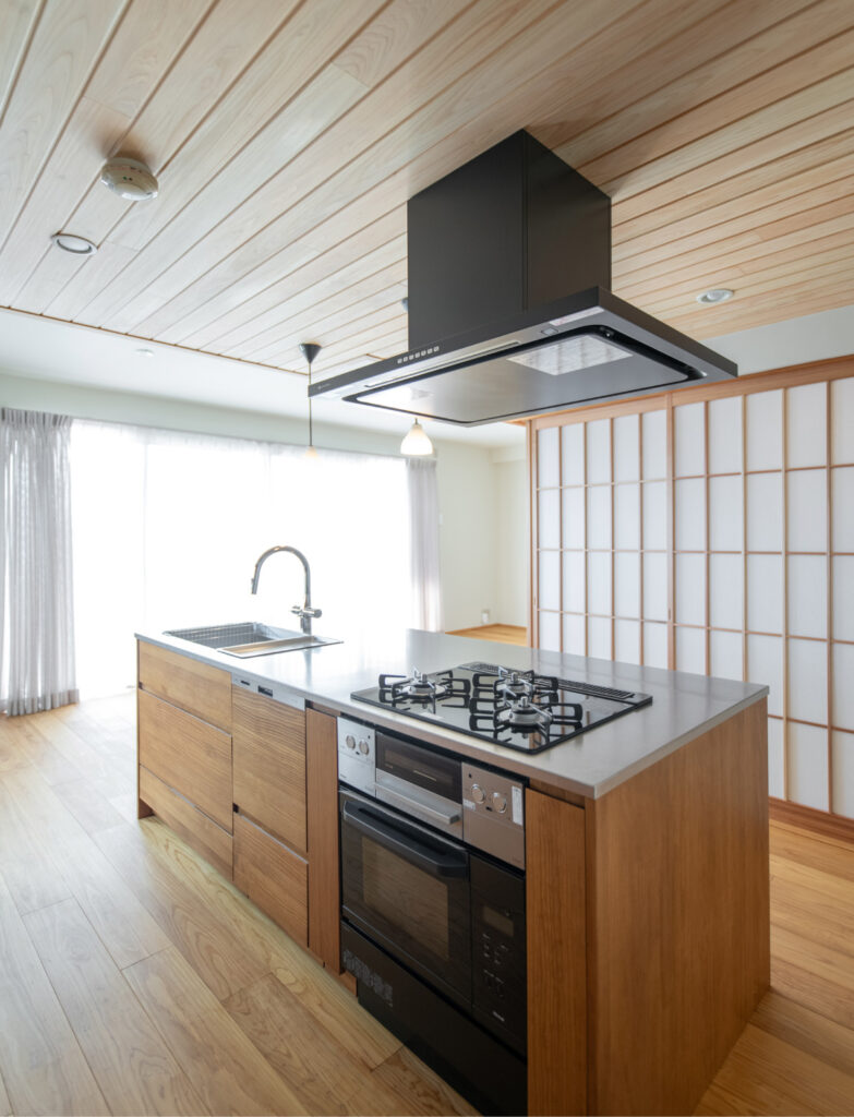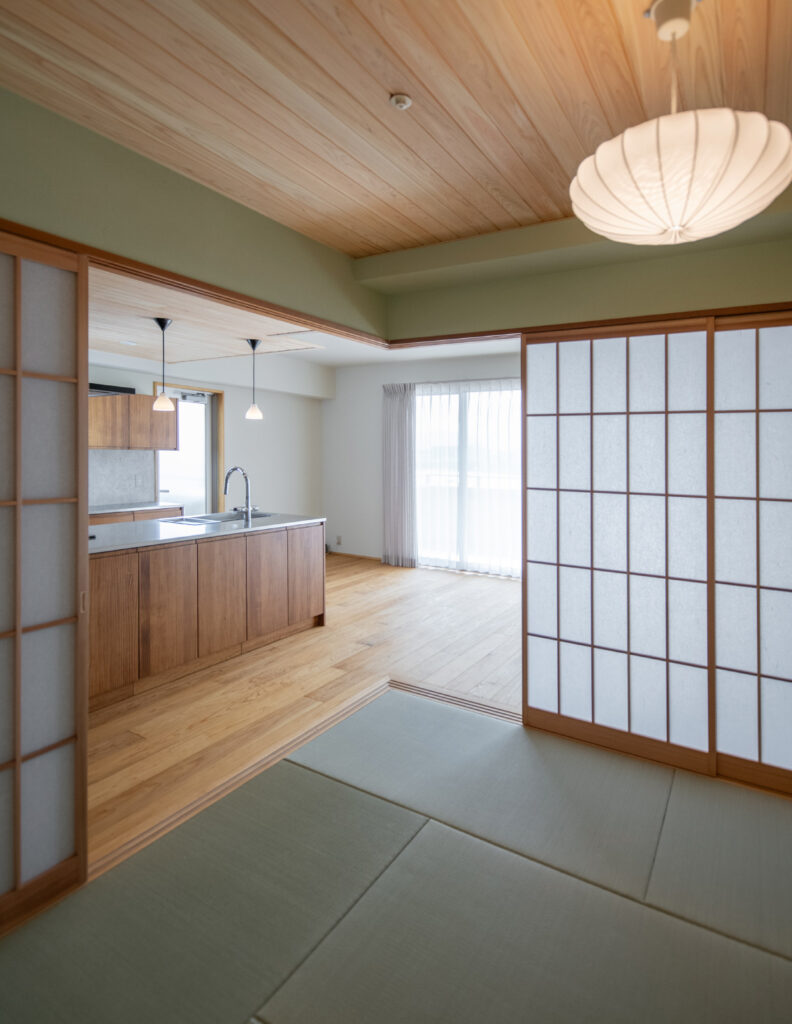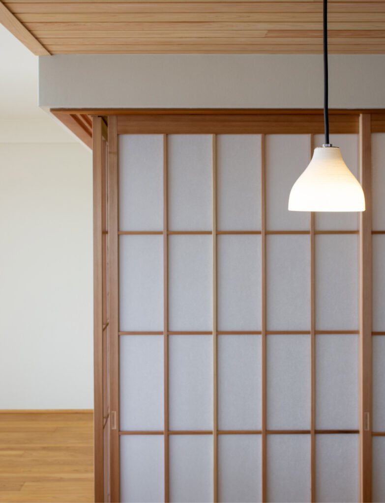 築20年のお住まいをリノベーション。床や天井、建具はシンプルな木目を生かし、和の趣ある空間になりました。和室の障子はフルオープンでき、暮らしのシーンによって空間を変えることができます。